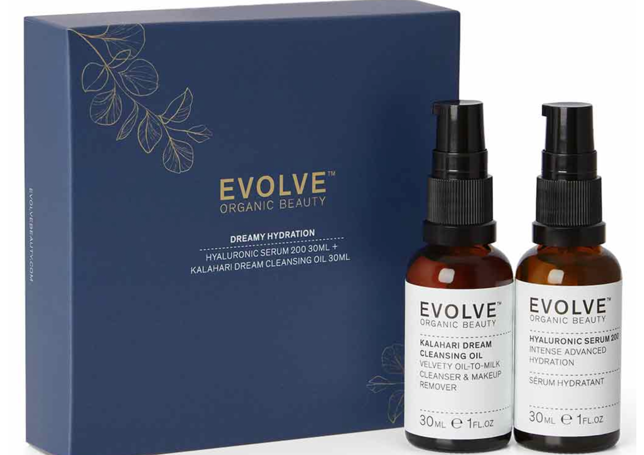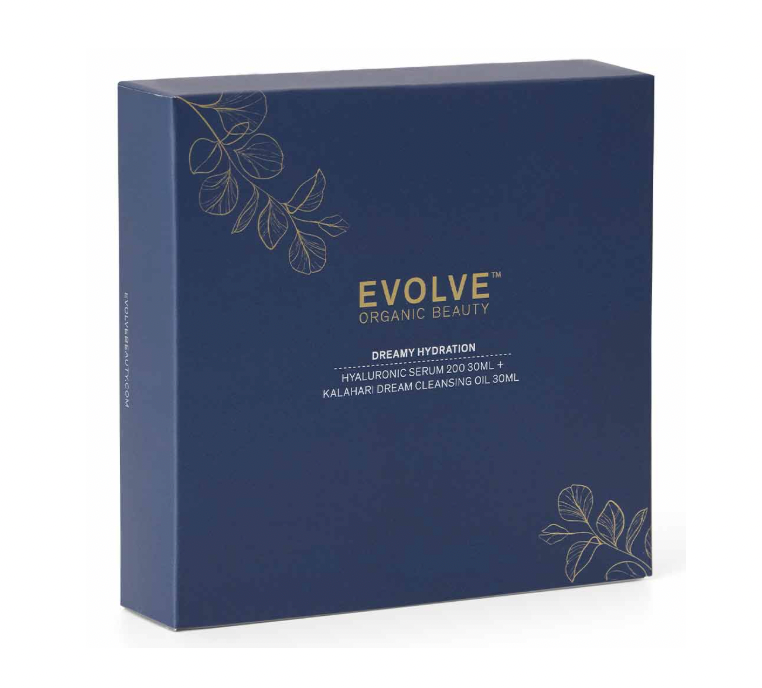 Kaksi Evolve Organic Beautyn suosikkituotetta, Kalahari Dream -puhdistusöljy ja Hyaluronic Serum 200 -hyaluronihapposeerumi saatavilla nyt yhdessä Dreamy Hydration lahjapakkauksessa, yhden hinnalla <3