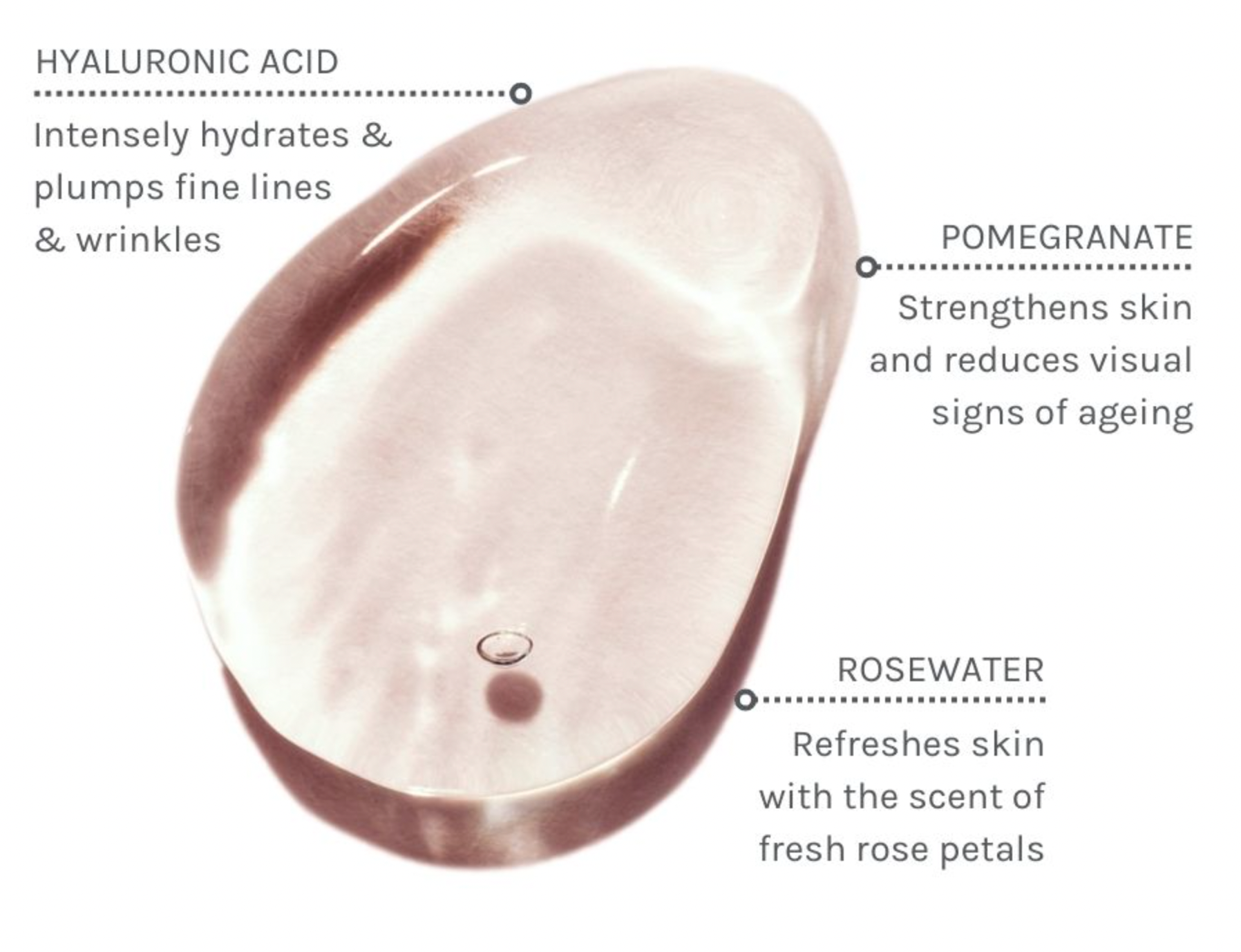 Aqua (water), Aloe Barbadensis Leaf Juice*, Rosa Damascena Flower Water*, Glycerin**, Pentylene Glycol (from sugar cane), Sodium Hyaluronate, Punica Granatum (Pomegranate) Fruit Extract*, Cellulose Gum, Algin, Phytic Acid, Citric Acid.